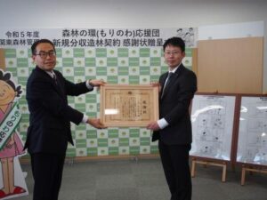 エス・エルワールド㈱(静岡市清水区宮加三642、杉山岳人社長)は3月、静鉄ホームズ㈱(焼津市大住915、保竹善之社長)と共同し、林野庁関東森林管理局と分収造林契約を締結した。同月、群馬県前橋市の同管理局森林整備部 森林整備課で感謝状贈呈式が行われた。