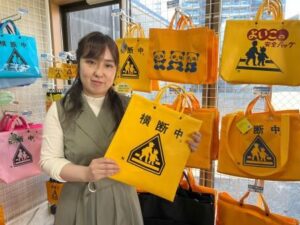 今春、静岡南署と共同開発した自転車ヘルメット専用横断バッグを発売した。ヘルメットを収納したバッグをワイヤー錠で自転車本体にくくりつけるためのリングがついているのが特徴だ。「令和5年4月に自転車の乗車用ヘルメットの着用が努力義務化されました。ヘルメット着用率が少しでも上がればと願っています」。現在、環境に配慮した商品としてSDGs横断バッグも開発中だ。「石油由来の材料を使わないバッグです。手にした子どもたちが環境を考えるきっかけになればと思っています」と杉山さんは話している。