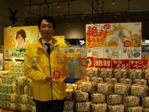 新ジャンル市場で圧倒的な売れ行きを続ける『のどごし<生>』は、2005年4月の発売から10年弱の期間で累計販売本数150億本を達成した。今年は夏季限定『のどごし<生>ICE』に続き、この冬にも冬季限定『冬のどごし<華やぐコク>』を発売し、ファンの拡大に取り組む。大角支社長は「ぜひ樽型サーバーを目指して頑張ってください!」と自ら店頭に立ちキャンペーンのPRに取り組んでいた。