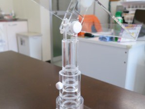 これまでのアクリル製・展示スタンドは、ドライバーを使って金属製のネジを固定していたため、ネジが緩んでしまったり、商品の重みで展示スタンドが低くなってしまうことがあったため、展示スタンドの可動範囲を含めて、「“使える展示スタンド”をつくった」と鈴木社長は言う。このほど、同社が開発したアクリル製の展示スタンドは、円形のアクリルパイプを使った立体的なもので、アクリル本体にネジを固定する溝が掘ってあるため、展示する商品の重みで台の高さが低くなってしまうことはなく、ドライバーを使ってネジを固定しなくても素手で容易に高さを微調整することができるという。商品を置く台座も360度回転するほか、商品を美味しく見せるように、美観にも配慮したデザインとなっている。