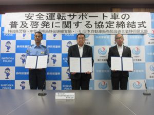 日本自動車販売協会連合会(自販連)静岡県支部(芹澤正明支部長)、国土交通省静岡運輸支局、県警は7月13日、安全運転サポート車(サポカー)の普及・啓発に向けた協定を締結した。