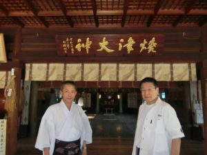 焼津神社が祭るヤマトタケルノミコトの崇拝者、伊藤明氏が拝殿に扁額を飾れないかと提案した。鈴木宮司は森町の小国神社に相談し、杭迫氏を紹介してもらった。伊藤氏が資金を都合し、焼津神社大祭が行われた8月13日に扁額を奉納した。