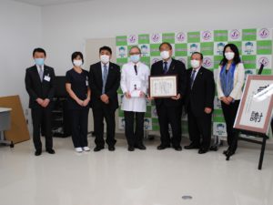 成島会長は「コロナ禍で頑張っていただいてる藤枝市立総合病院の皆さまに感謝と応援の気持ちを込めて、クオカードを寄贈させていただきます」とあいさつ。中村院長は「これからも、市民の皆さまのために力を尽くしていきます」と御礼を述べた。