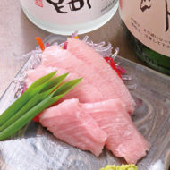 看板メニューの熟成刺身はその名の通り、仕入れた鮮魚を独自の手法で熟成させた一品だ。マグロ、サワラ、金目鯛、アジなど取り扱う魚もさまざまで、それぞれ味わいが異なるという。「例えばマグロの中トロは、熟成させると融点が低くなり、舌の上でねっとりと蕩ける食感になります。さらにアミノ酸が増すため旨味とコクが増します。刺身は鮮度が一番という方にもぜひ一度違いを確かめてもらえればうれしいですね」。